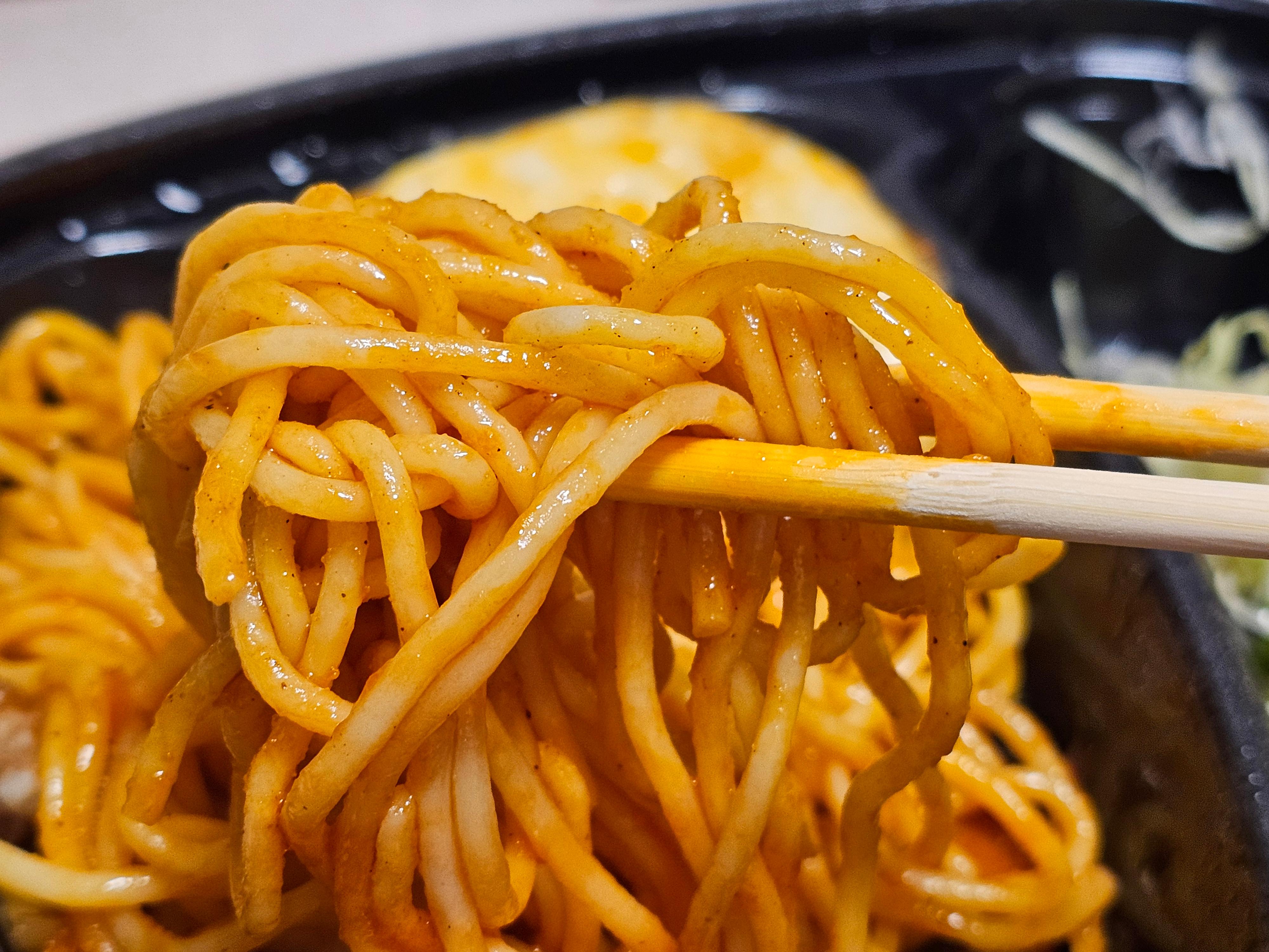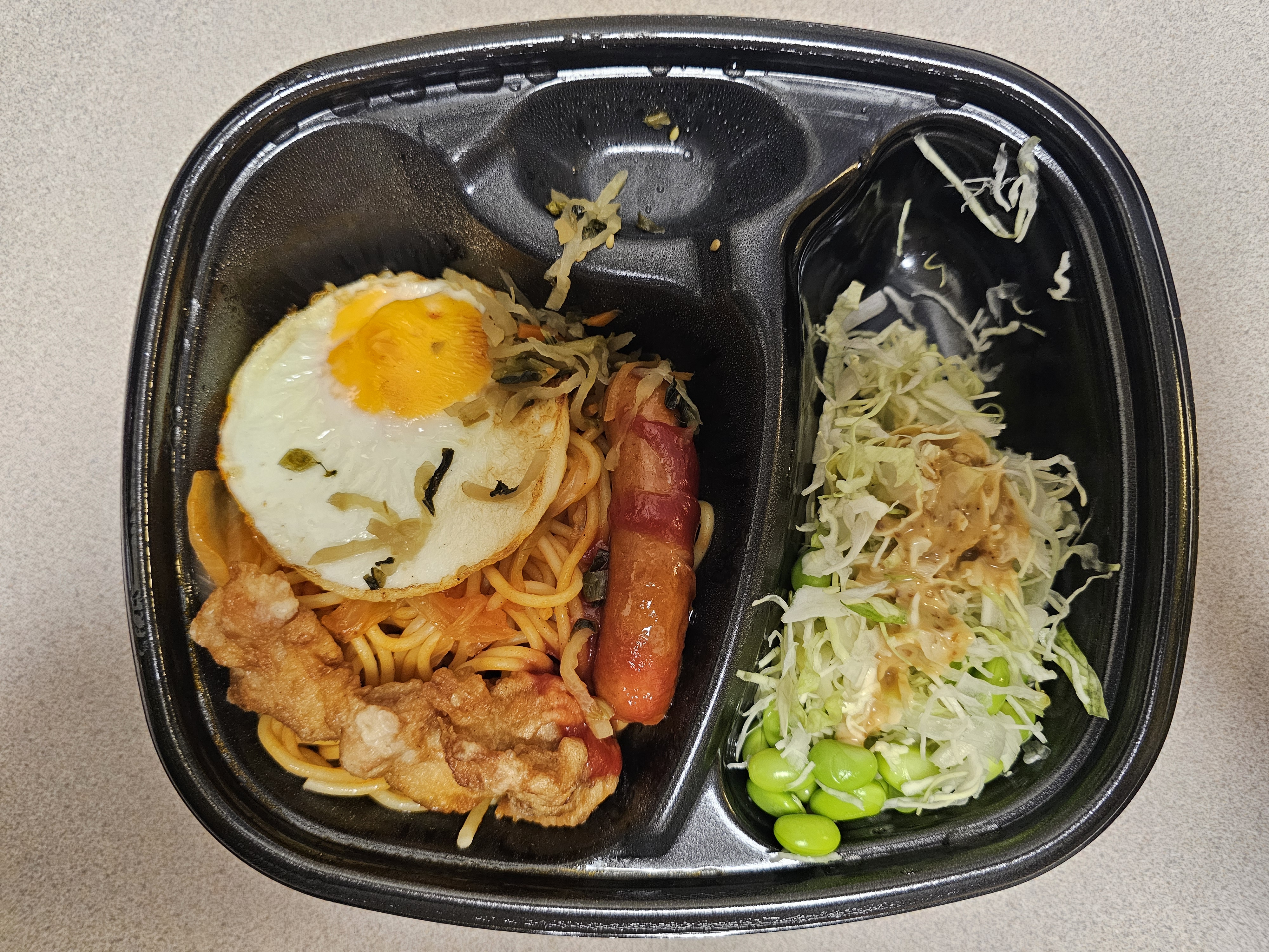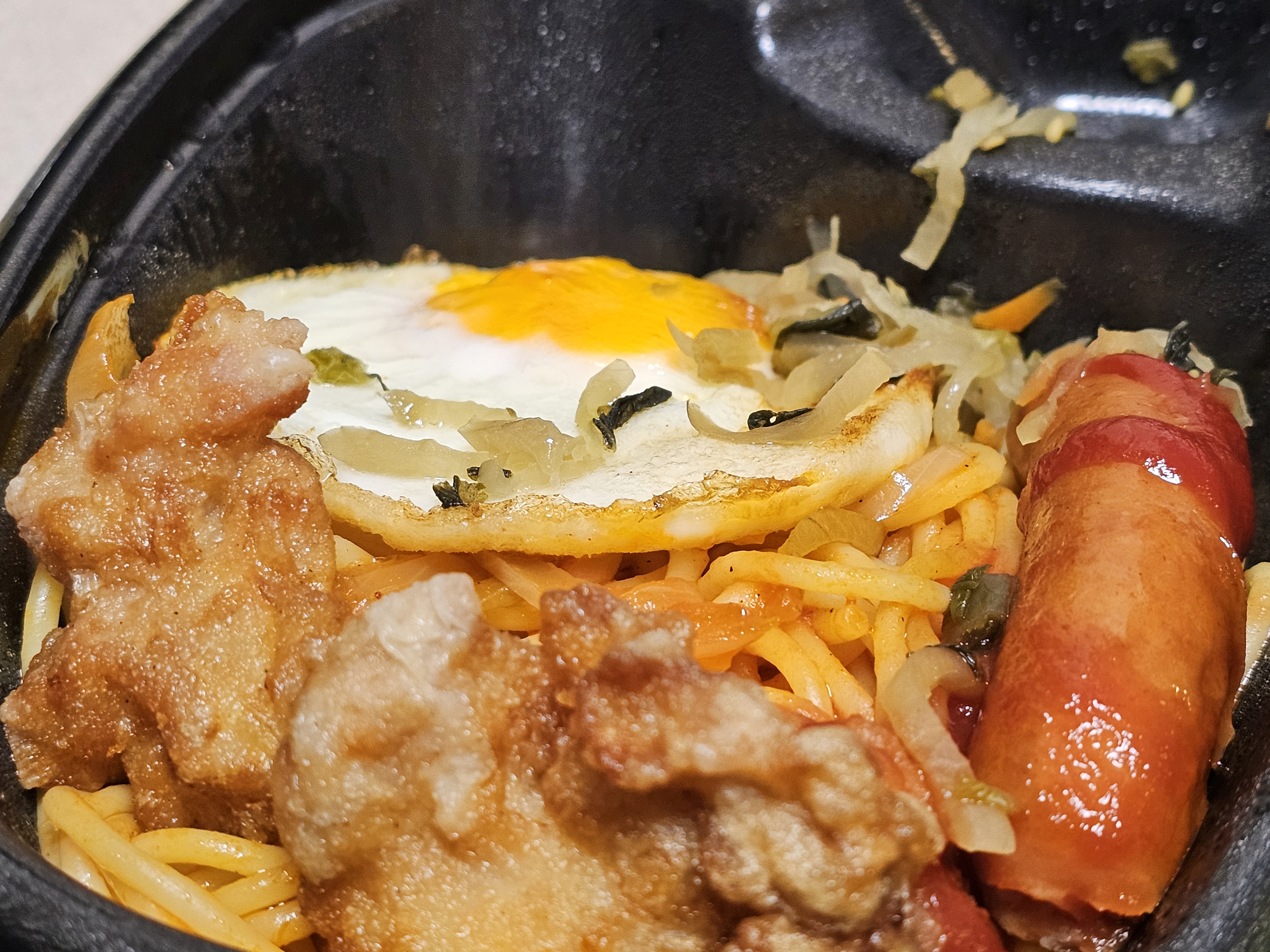 케첩 베이스로 볶은 스파게티 위에 달걀프라이, 소시지, 가라아게가 올라가 있었습니다.