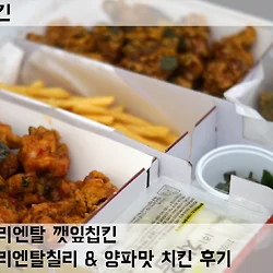예전부터 무슨 맛일지 궁금했던 코레엔탈 깻잎칩킨을 주문했다. 코리엔탈 깻잎칩킨에는 14가지 맛이 있는데, 그 중 양파맛과 오리엔탈칠리 치킨을 선택했다. 간혹 잔뼈나 물렁뼈가 나올 수 있고, 치킨 색상이 진하게 나올 수 있다고 한다. 오리엔탈칠리 치킨, 양파맛 치킨, 감자튀김, 김말이튀김, 깻잎, 치킨무가 들어있고, 사진에서는 제외했지만 500ml 코카콜라가 함께 배달되었다. 깻잎치킨이라고 해서 무척 기대했는데, 튀김옷에 깻잎을 넣은게 아니라 다 조리한 치킨 위에 깻잎 몇 장 잘라서 올린 거였다. 원래는 고소루 치킨이라는 것을 주문하려 했는데, 고소루 치킨이 인기가 없어서 재료 신청 안 했다고 했다. 식자재 마트에서 파는 큰 봉지에 담겨져 있는 김말이 튀김맛. 적당히 매콤했던 오리엔탈칠리 치킨. 매운맛을 ..