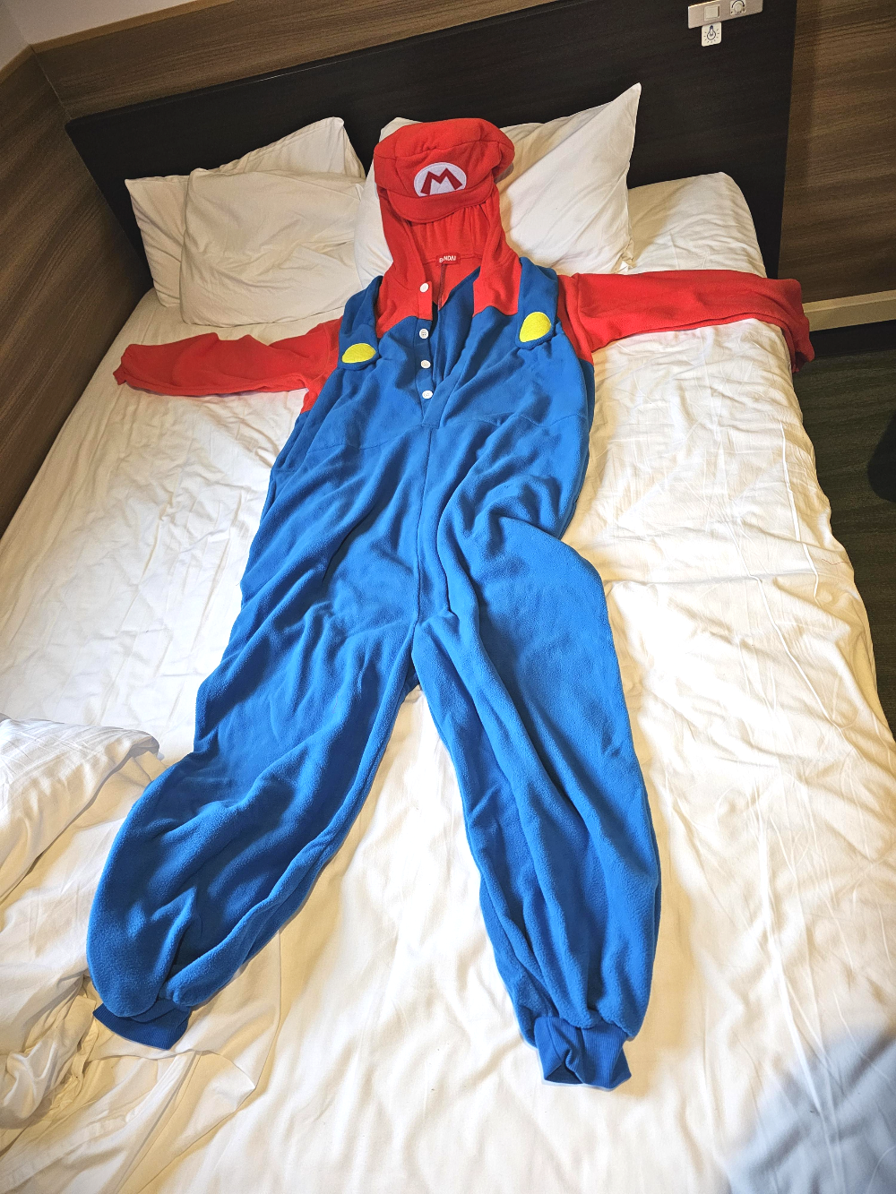 샤워를 끝마치고, 어제 메가 돈키호테에서 구입한 슈퍼마리오 코스프레 의상을 꺼내봅니다.